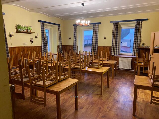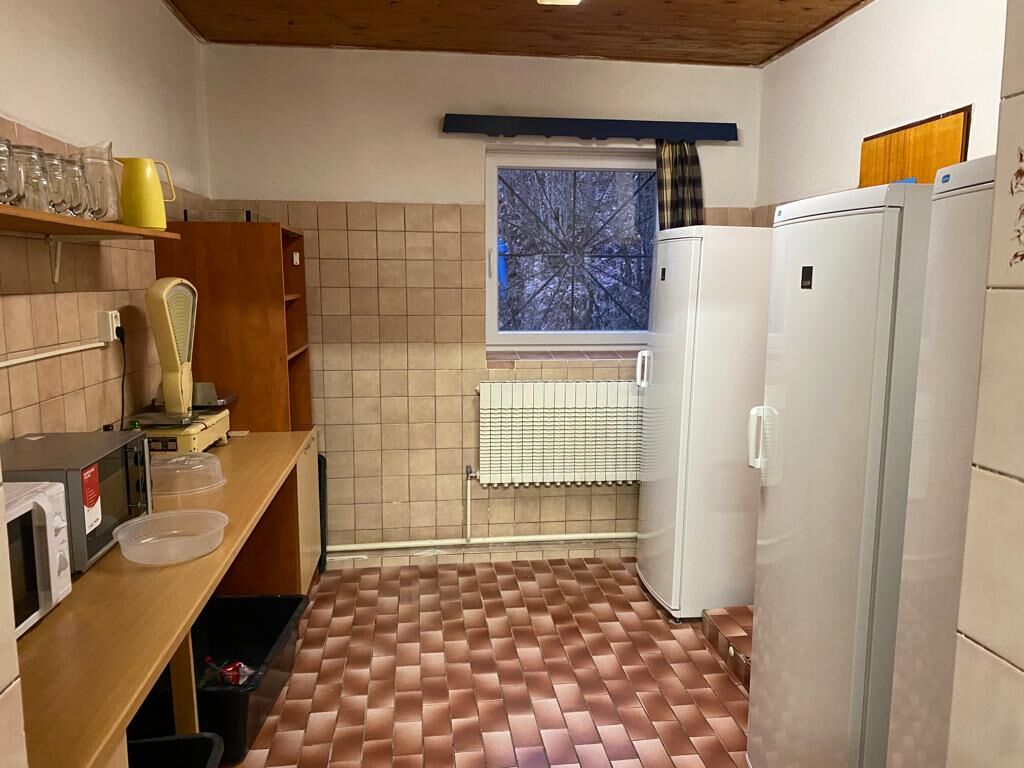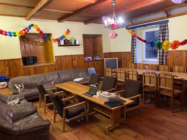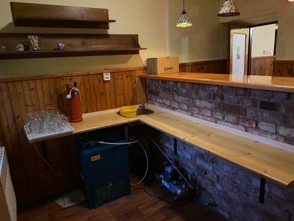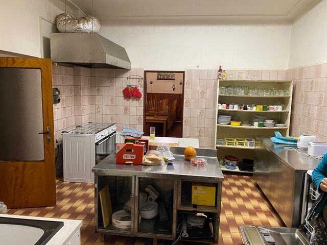 V přízemí , vybavená kuchyně , sklad potravin , jídelna , společenská místnost , bar s výčepním zařízením ,